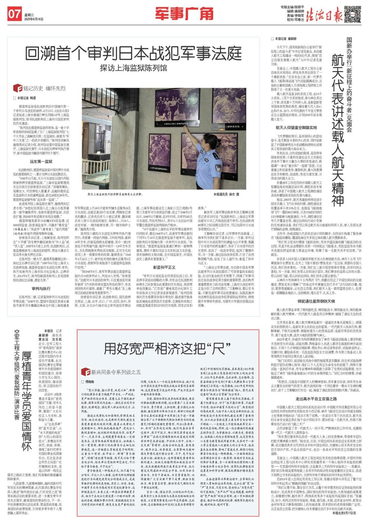 在奮進強軍興軍新征程中,全軍部隊必須深入貫徹依法治軍戰(zhàn)略,充分認清“寬”和“嚴”是手段、不是目的,堅決防止“為寬而寬”的不良傾向、“為嚴而嚴”的主觀隨意,始終堅持“寬嚴相濟”的處分原則,進一步加強紀律建設,維護和鞏固鐵的紀律,確保軍隊絕對忠誠、絕對純潔、絕對可靠。