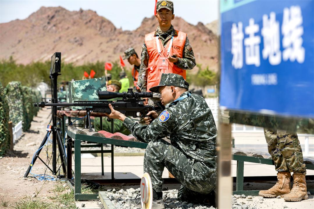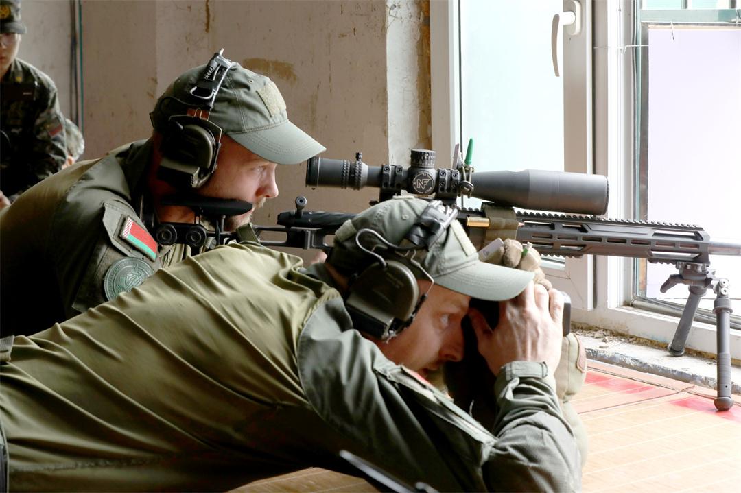 圖為7月17日,白俄羅斯參賽隊員在新疆烏魯木齊武警部隊某訓練基地參加“城市要點控守狙擊”課目競賽。趙俊杰 攝
