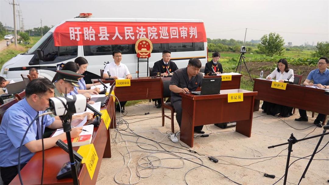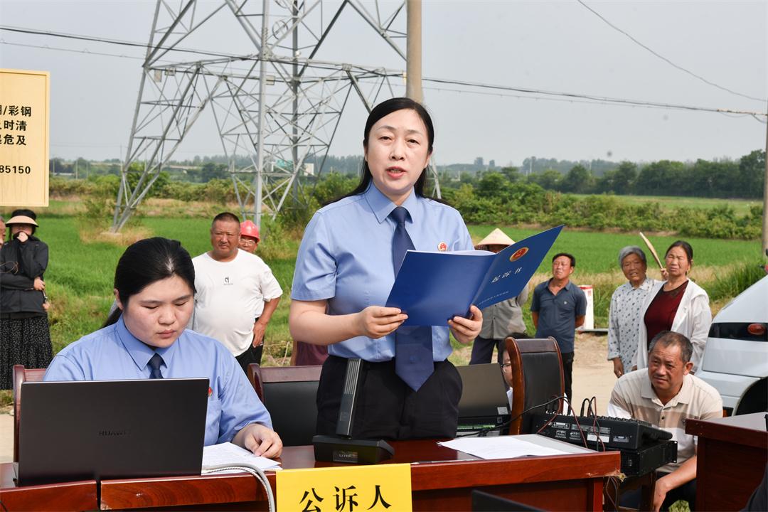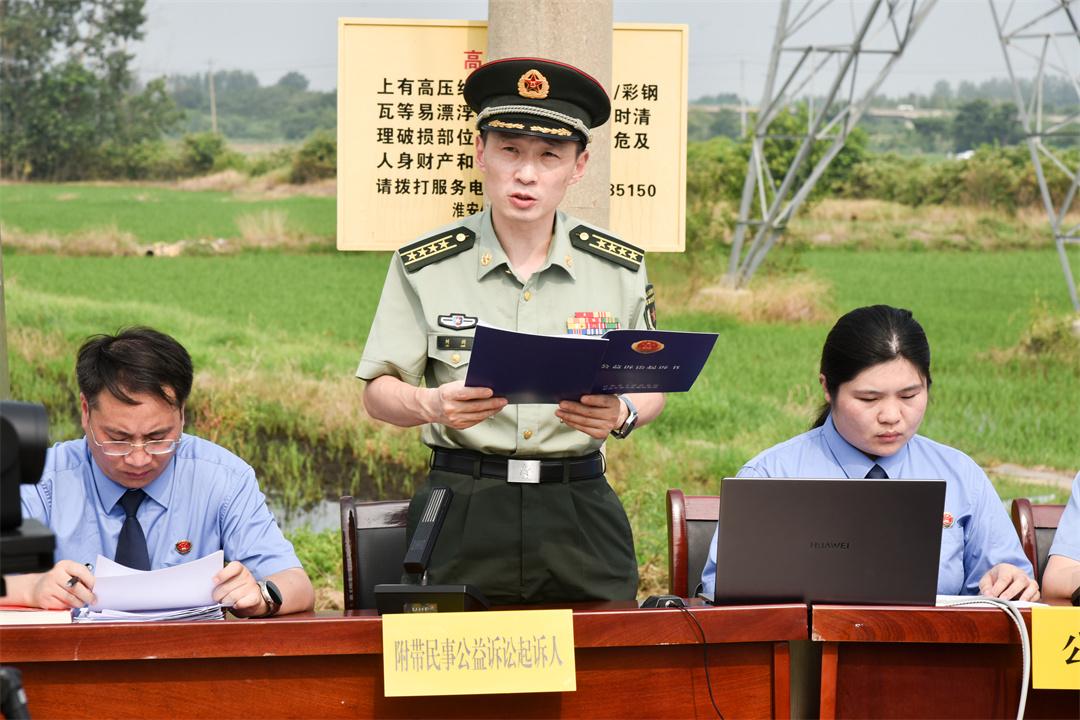 7月15日,解放軍南京軍事檢察院協(xié)同淮安市盱眙縣人民檢察院,對(duì)一起過失損壞軍事通信案提起刑事附帶民事公益訴訟,并在案發(fā)地盱眙縣馬壩鎮(zhèn)一處農(nóng)田間公開開庭審理。盱眙縣人民檢察院檢察長潘凌云作為公訴人出庭指控犯罪,南京軍事檢察院大校檢察長劉劍作為附帶民事公益訴訟起訴人出庭提起民事公益訴訟,盱眙縣人民法院院長田庚擔(dān)任審判長。為加大案件警示教育效果,庭審邀請(qǐng)全國人大代表、江蘇省人大代表、部隊(duì)有關(guān)人員,以及案發(fā)地附近村民100余人參與旁聽。