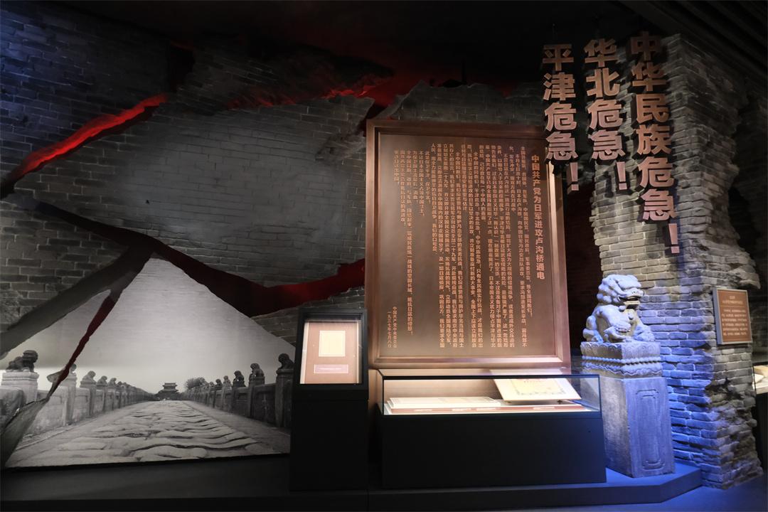 “全中國(guó)的同胞們!平津危急!華北危急!中華民族危急!只有全民族實(shí)行抗戰(zhàn),才是我們的出路!”一則《中國(guó)共產(chǎn)黨為日軍進(jìn)攻盧溝橋通電》原文被放大并“搬”上展墻,一行行大字尤為醒目,字字千鈞。主題展覽第二部分“七七事變”場(chǎng)景,瞬間將觀眾拉回88年前的盧溝橋畔,也是很多觀眾反饋印象最深刻的場(chǎng)景之一。