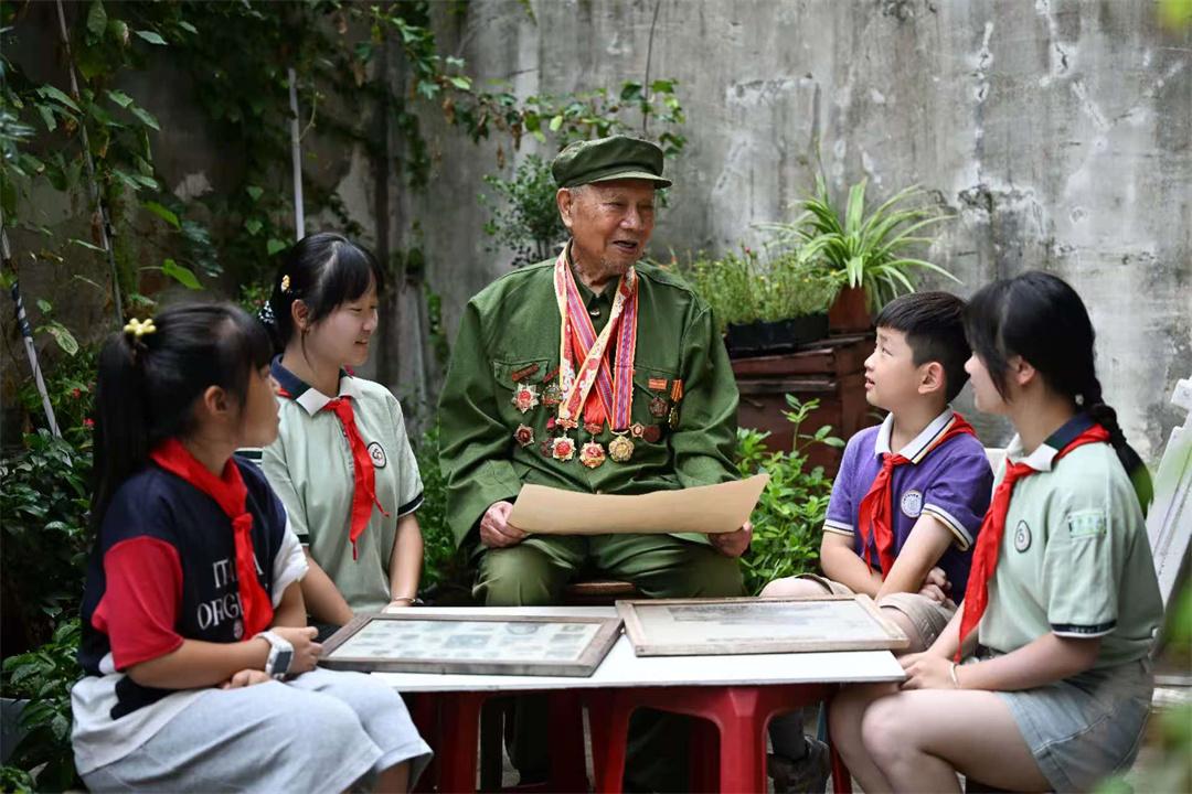 圖為孩子們走進(jìn)老兵家中,聆聽(tīng)?wèi)?zhàn)斗故事。