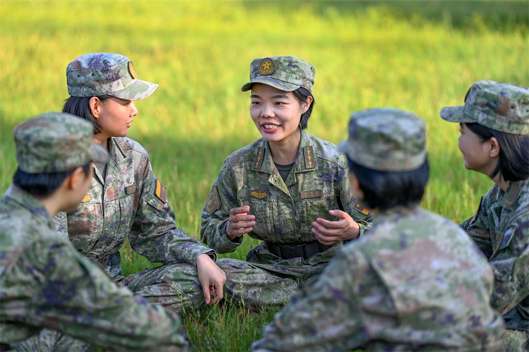 圖為訓(xùn)練間隙,陳東森(中)組織班組女兵集體談心。