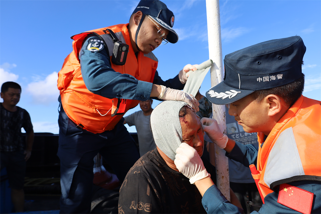 中國海警局直屬第三局橫琴艦接警后立即組織航渡救援,克服夜航能見度較差以及2米海浪的惡劣海況,快速馳援。抵達(dá)現(xiàn)場后,橫琴艦兩名海警醫(yī)務(wù)人員對傷員迅速進(jìn)行救治,實施止血包扎、口服補液等緊急醫(yī)療措施,及時有效穩(wěn)定了傷員狀況。