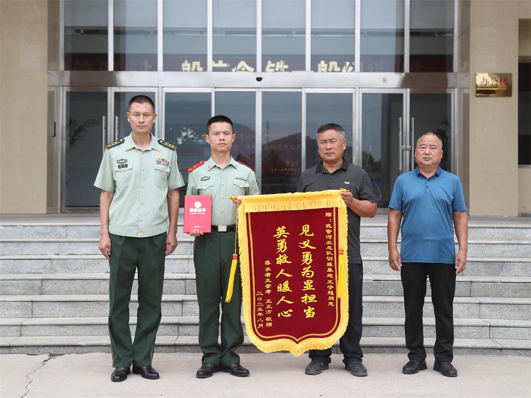 “感謝王守超同志救了我們兩個人,拯救了兩個家庭,武警戰(zhàn)士好樣的!”不久前,河南省濮陽市范縣龍王莊鎮(zhèn)孟樓村村民王正方一行來到武警河北總隊訓練基地,將一面繡著“見義勇為顯擔當 英勇救人暖人心”的錦旗,以及范縣見義勇為評定委員會頒發(fā)的“見義勇為先進個人”證書,鄭重遞到該基地王守超手中。