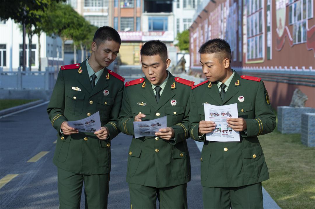 圖為官兵對(duì)法律宣傳單內(nèi)容進(jìn)行學(xué)習(xí)。唐明洋 攝