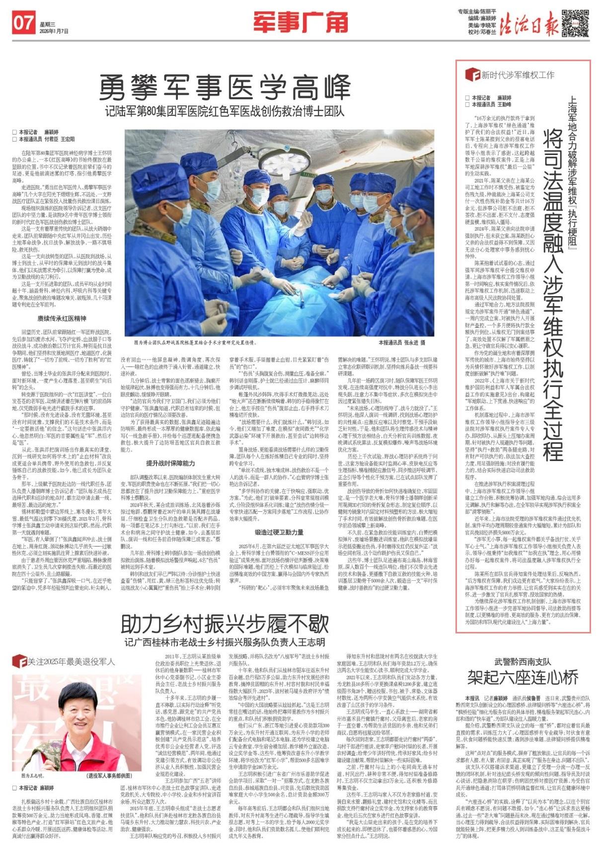 為繼續(xù)深化涉軍維權(quán)工作機制創(chuàng)新,上海市涉軍維權(quán)工作領(lǐng)導小組進一步完善軍地協(xié)同督導、司法救助銜接等制度,以更精準的舉措、更高效的服務(wù)、更有力的法治保障,為國防和軍隊現(xiàn)代化建設(shè)注入“上海力量”。