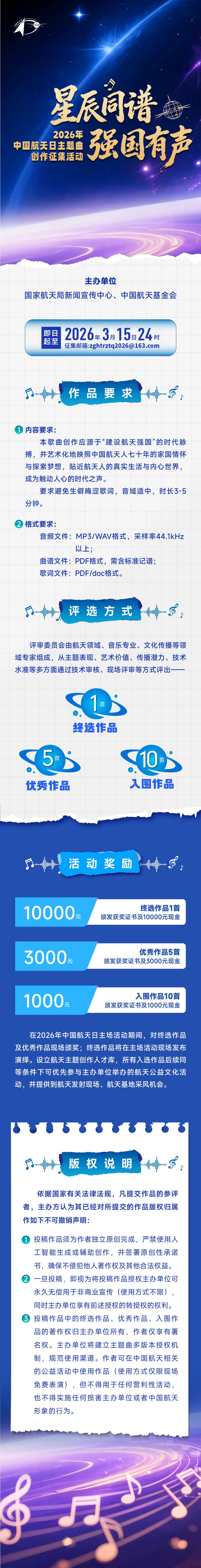 在2026年中國航天日主場活動期間,將對終選作品及優(yōu)秀作品現(xiàn)場頒獎;終選作品將在主場活動現(xiàn)場發(fā)布演繹。
