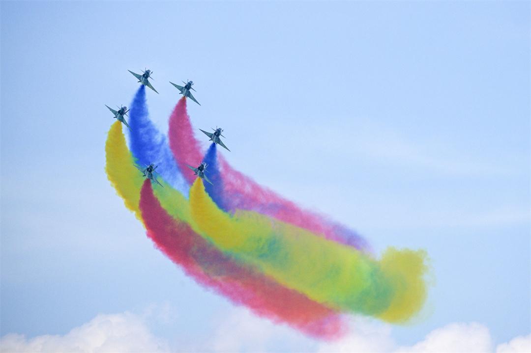 13時(shí)許,噴涂中國(guó)國(guó)旗和八一軍徽的表演機(jī)抵達(dá)樟宜展覽中心海面上空,率先編成超密集六機(jī)大箭隊(duì),在空中拉出紅、黃、藍(lán)3種顏色6道彩煙,以低空通場(chǎng)形式展現(xiàn)特殊禮儀,用“彩虹”向各國(guó)來(lái)賓致以最真摯的問(wèn)候。