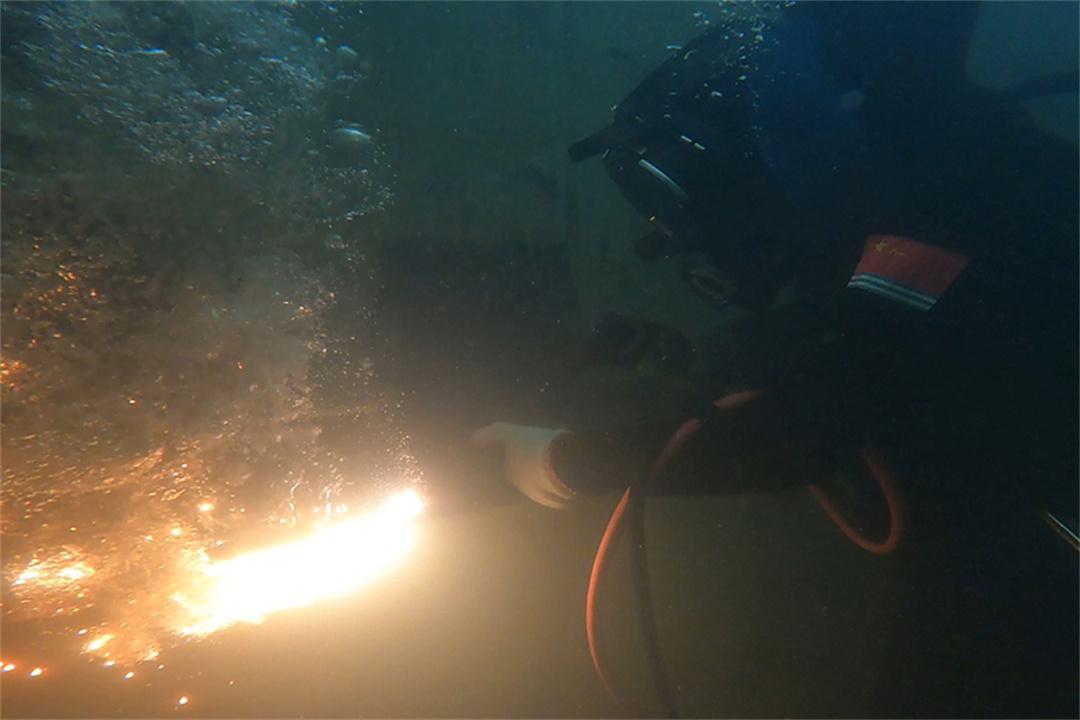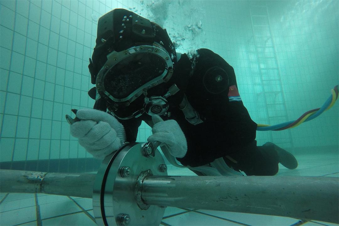 圖為中隊(duì)潛水員水下連接法蘭。張濱 攝