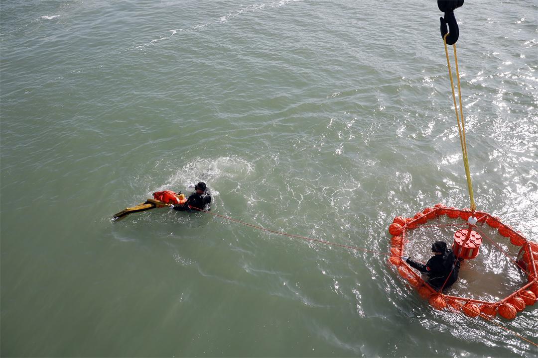 應(yīng)急搶險(xiǎn)分隊(duì)抵達(dá)后,曹守杰第一個(gè)下水探摸情況。潛至海底,厚厚的淤泥掩過(guò)膝蓋,海水夾雜著泥沙渾濁無(wú)比,能見(jiàn)度幾乎為零。