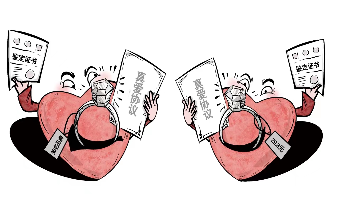近日,據(jù)媒體報(bào)道,在七夕佳節(jié)前,電商平臺(tái)上又涌現(xiàn)出一批廉價(jià)求婚鉆戒,價(jià)格在幾十元不等,還可以定制配套的“真愛(ài)協(xié)議”、珠寶鑒定證書以及包裝禮盒,銷售火爆。有記者調(diào)查發(fā)現(xiàn),這些商品都是某知名品牌鉆戒的“山寨版”,進(jìn)貨價(jià)甚至可能只有個(gè)位數(shù)。