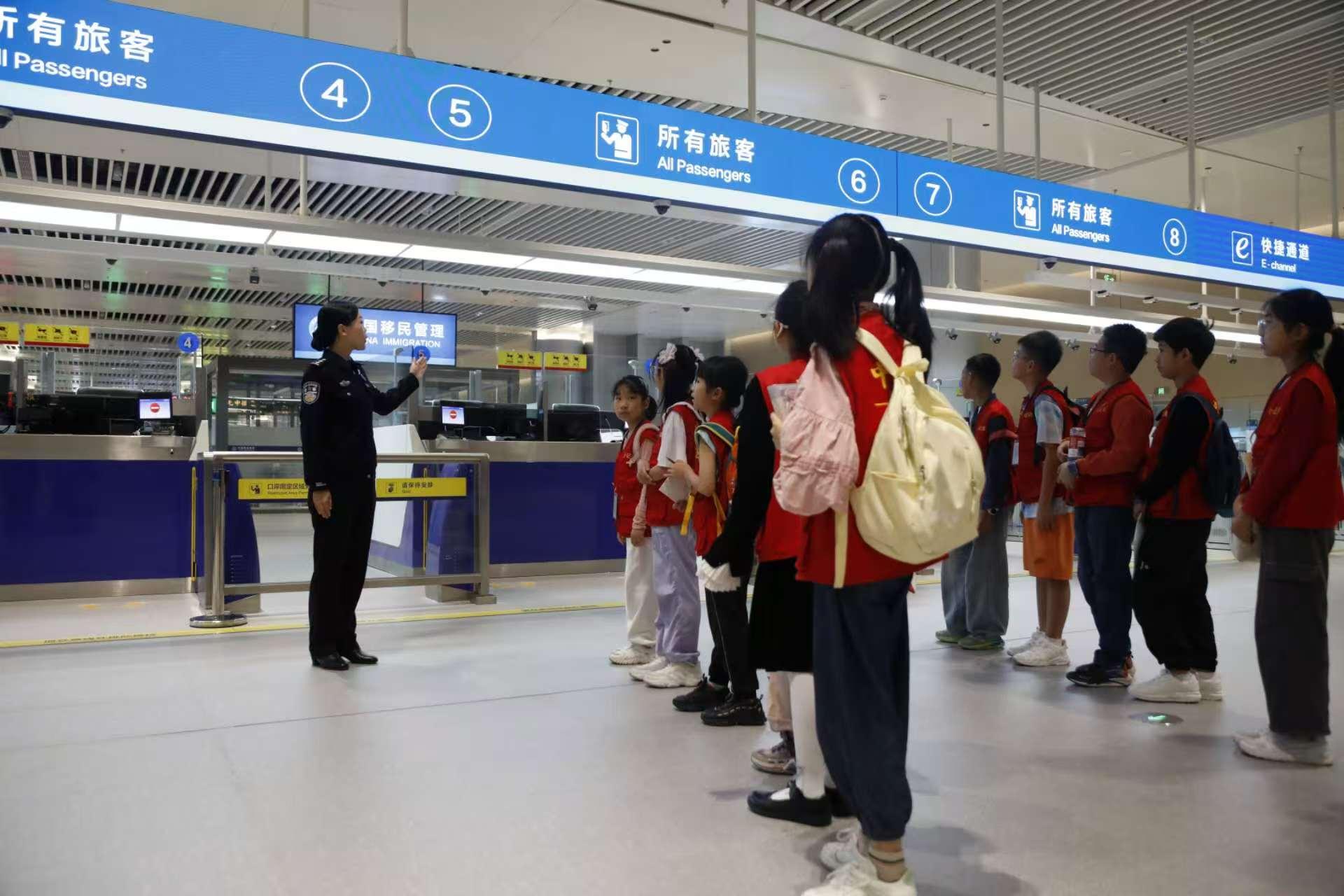 小學(xué)生們在移民管理警察的帶領(lǐng)下,先后參觀了新口岸出境大廳、碼頭泊位及入境大廳,現(xiàn)場體驗(yàn)穿戴警用裝備。