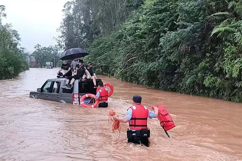 6月15日0時至17時,懷集縣公安局110接處警服務(wù)臺就接到因臺風(fēng)“蝴蝶”引發(fā)的水浸等警情11起。其間,累計出動警力1300余人次,協(xié)助轉(zhuǎn)移受災(zāi)群眾231名、被浸車輛76輛,并聯(lián)合應(yīng)急、消防救援力量開展救援行動24次。