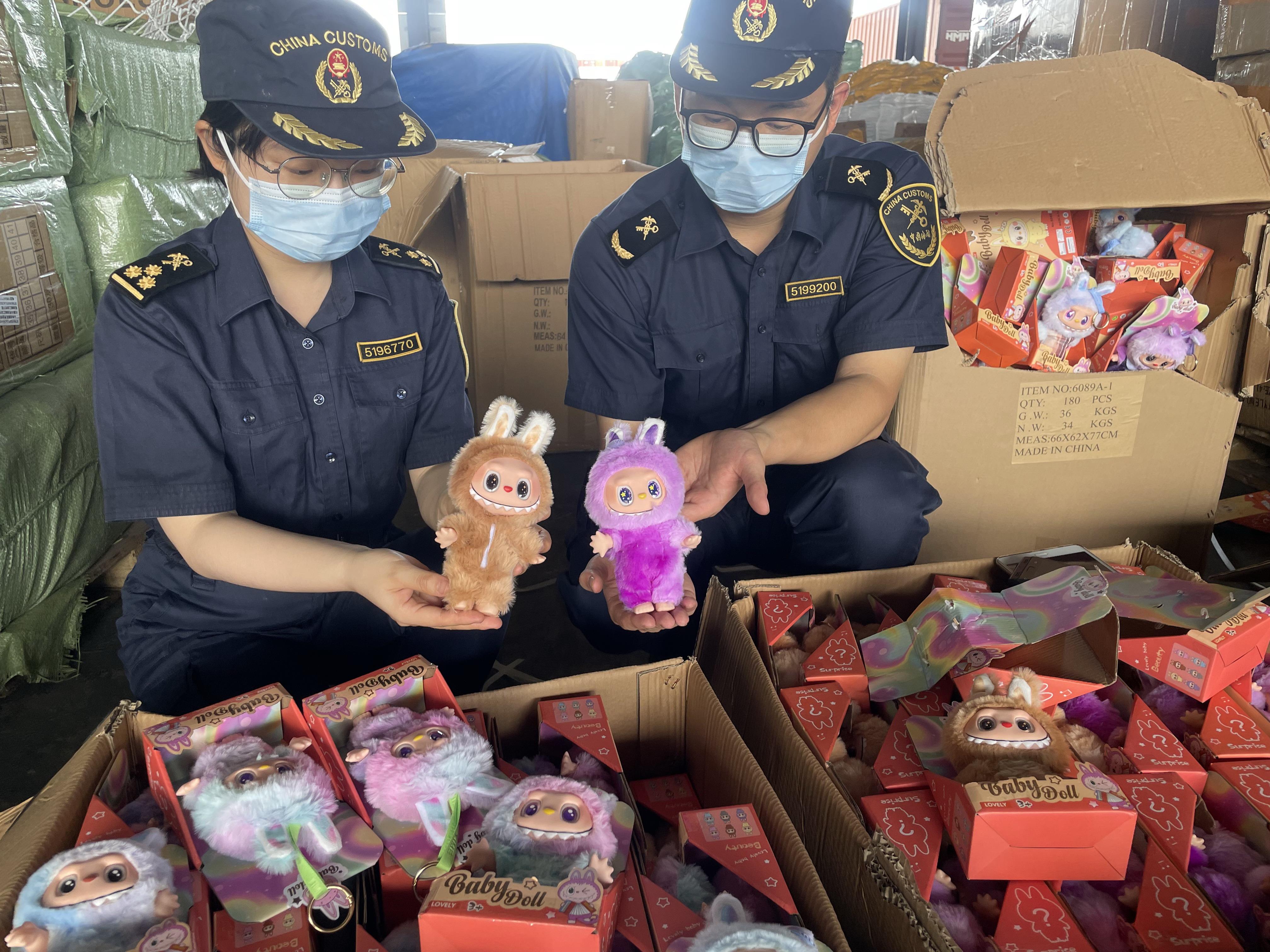 廣州海關(guān)所屬南沙海關(guān)關(guān)員在對(duì)一票申報(bào)為“玩具”的出口貨物進(jìn)行查驗(yàn)時(shí),發(fā)現(xiàn)該批貨物申報(bào)為“無(wú)品牌”,但紙箱中的毛絨玩具與泡泡瑪特當(dāng)前熱門(mén)的Labubu系列產(chǎn)品高度相似。經(jīng)聯(lián)系相關(guān)知識(shí)產(chǎn)權(quán)權(quán)利人確認(rèn),上述貨物為涉嫌侵犯其知識(shí)產(chǎn)權(quán)的產(chǎn)品。