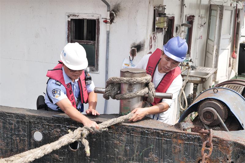 在強化船舶安全保障的基礎上,中山邊檢站聚焦口岸重點區(qū)域防御,組織執(zhí)勤警力深入口岸限定區(qū)域、集裝箱堆場、碼頭作業(yè)區(qū)等關鍵部位開展拉網式排查。民警們對防風設施、排水系統(tǒng)、電路設備等進行細致檢查,及時督促整改松動廣告牌、積水隱患點等問題,協助碼頭企業(yè)加固易受風雨影響的物資設備,從源頭降低事故風險。依托船訊網、智能監(jiān)控系統(tǒng)等科技平臺,邊檢站同步開展“線上”動態(tài)監(jiān)管,實時核查口岸及錨地船舶軌跡,嚴密防范臺風期間可能出現的非法出入境、擅自搭靠、違規(guī)上下輪等違法違規(guī)行為,確保特殊天氣下口岸管控不松懈。