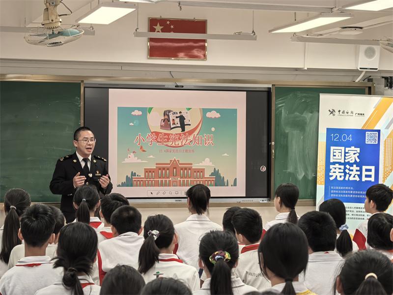 12月3日下午,在位于廣東省廣州市天河區(qū)的天府路小學(xué)建業(yè)校區(qū)內(nèi),兩個(gè)六年級(jí)班級(jí)的共90多名學(xué)生正在聆聽(tīng)一場(chǎng)內(nèi)容豐富、形式生動(dòng)的憲法宣傳和國(guó)門(mén)安全教育課。