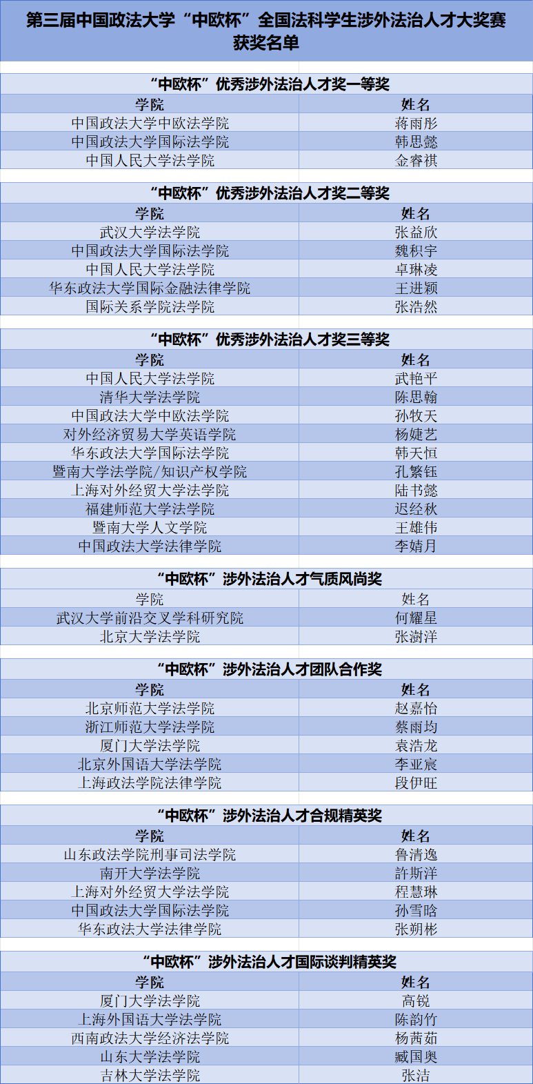 經(jīng)過激烈角逐,最終來自全國28所法學(xué)院系的35名同學(xué)脫穎而出。復(fù)賽共評(píng)選出:“中歐杯”優(yōu)秀涉外法治人才一等獎(jiǎng)3名、二等獎(jiǎng)5名、三等獎(jiǎng)10名,“涉外法治人才氣質(zhì)風(fēng)尚獎(jiǎng)”2名,“涉外法治人才團(tuán)隊(duì)合作獎(jiǎng)”5名,“涉外法治人才合規(guī)精英獎(jiǎng)”5名,“涉外法治人才國際談判精英獎(jiǎng)”5名。