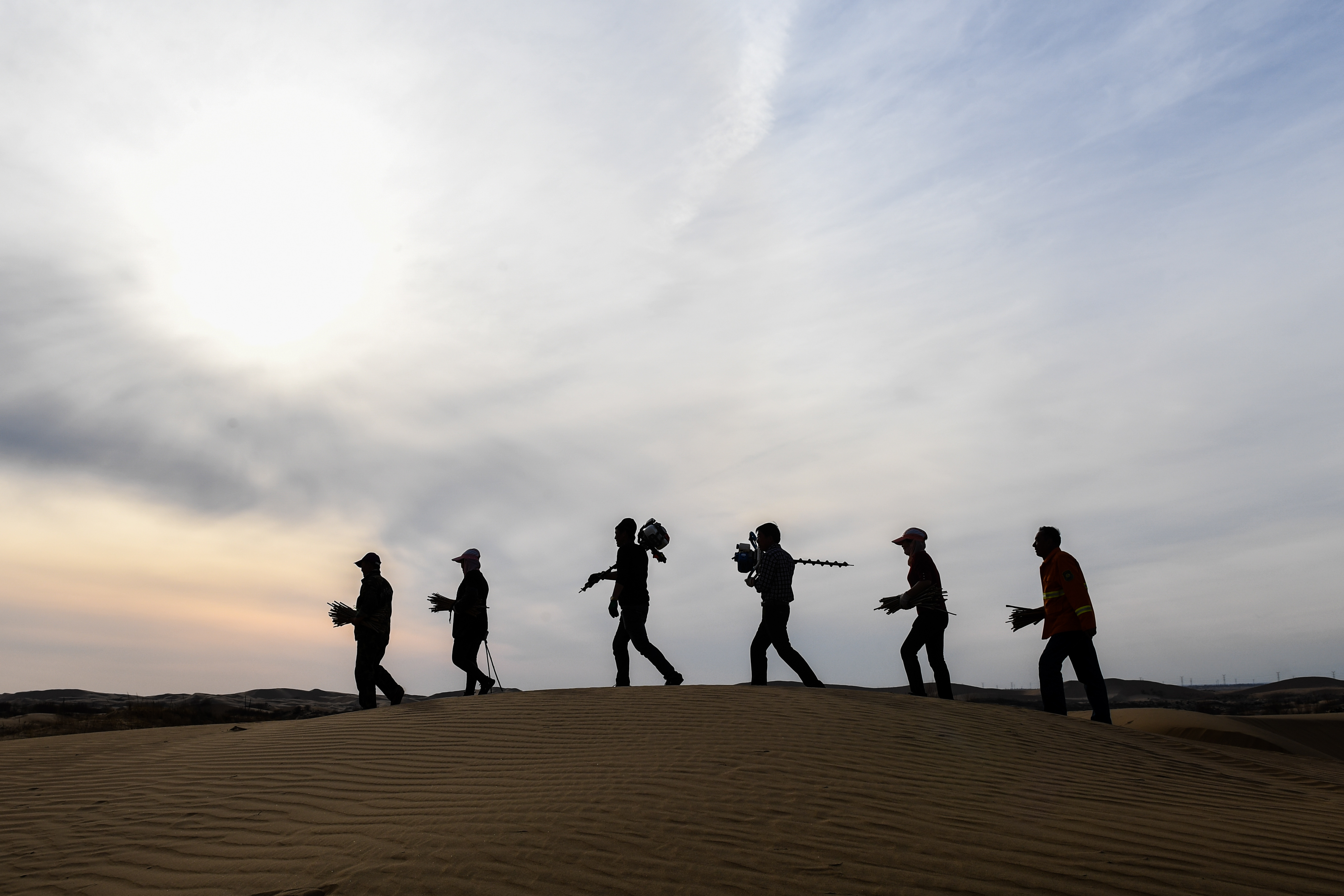 4月1日,在達(dá)拉特旗銀肯塔拉的沙漠中,治沙工人前往下一處種植點(diǎn)。