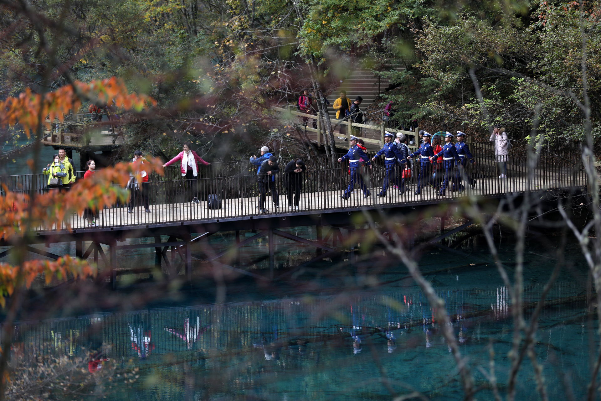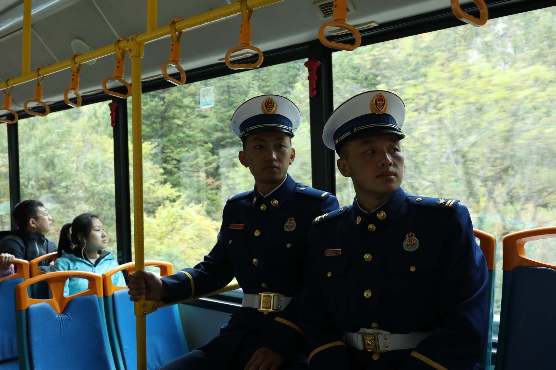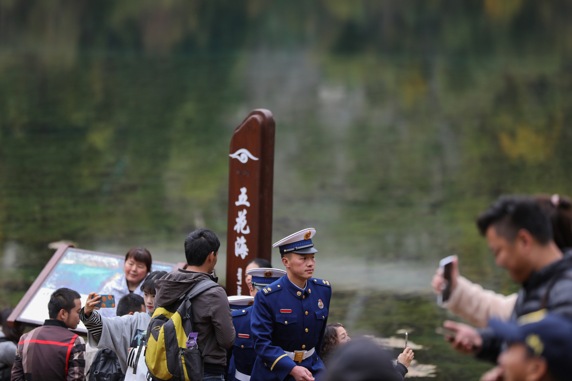 廖海州和中隊長倪磊并肩巡邏在五花海景點的棧道上,“前年地震,我們從這里抬出來了好幾個受傷游客.....”這對同年入伍的老隊員 最能聊到一起。