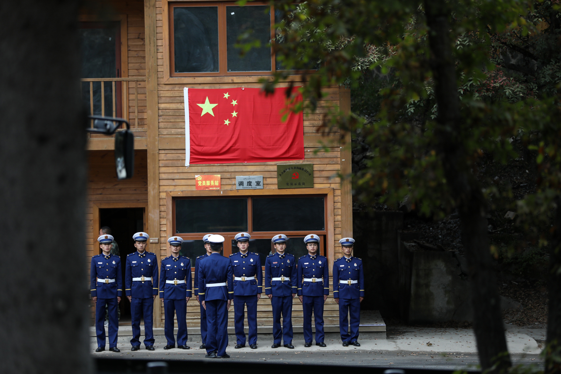隊員們在景區(qū)調(diào)度室門前集合出發(fā)。