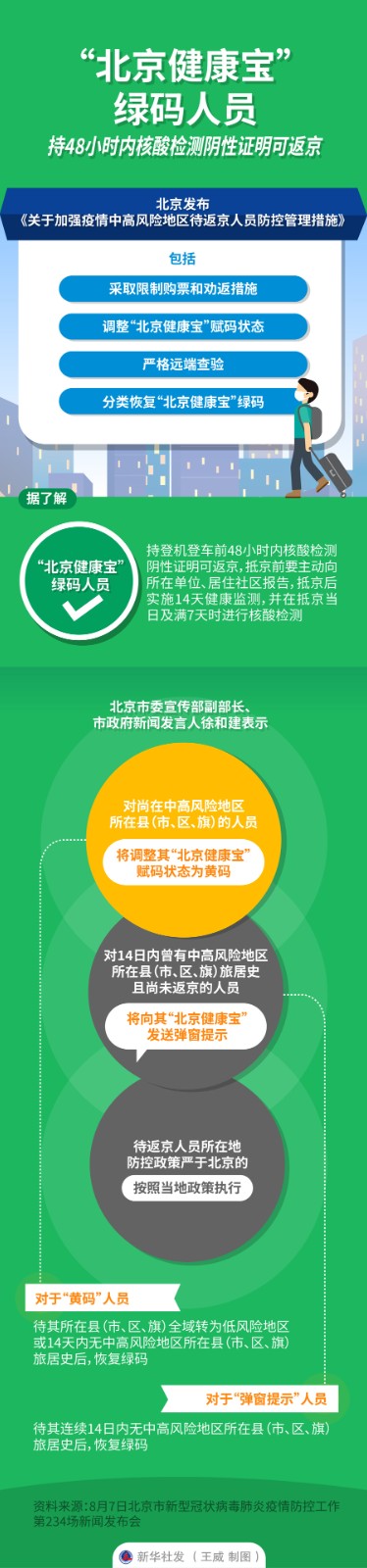 記者8月7日從北京市新型冠狀病毒肺炎疫情防控工作第234場新聞發(fā)布會獲悉,北京發(fā)布《關(guān)于加強疫情中高風險地區(qū)待返京人員防控管理措施》,包括采取限制購票和勸返措施、調(diào)整“北京健康寶”賦碼狀態(tài)、嚴格遠端查驗、分類恢復“北京健康寶”綠碼。