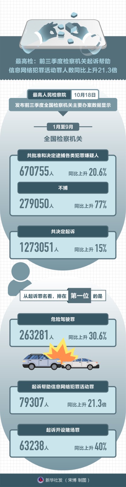 最高人民檢察院10月18日發(fā)布前三季度全國(guó)檢察機(jī)關(guān)主要辦案數(shù)據(jù)顯示,1月至9月,全國(guó)檢察機(jī)關(guān)共批準(zhǔn)和決定逮捕各類犯罪嫌疑人670755人,同比上升20.6%,不捕279050人,同比上升77%;共決定起訴1273051人,同比上升15%。