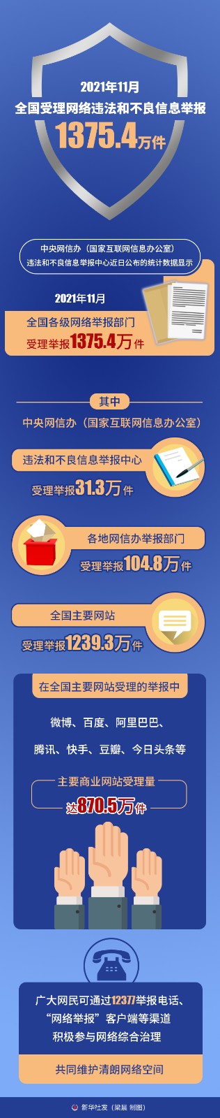 中央網(wǎng)信辦(國家互聯(lián)網(wǎng)信息辦公室)違法和不良信息舉報中心近日公布的統(tǒng)計數(shù)據(jù)顯示,今年11月,全國各級網(wǎng)絡(luò)舉報部門受理舉報1375.4萬件。