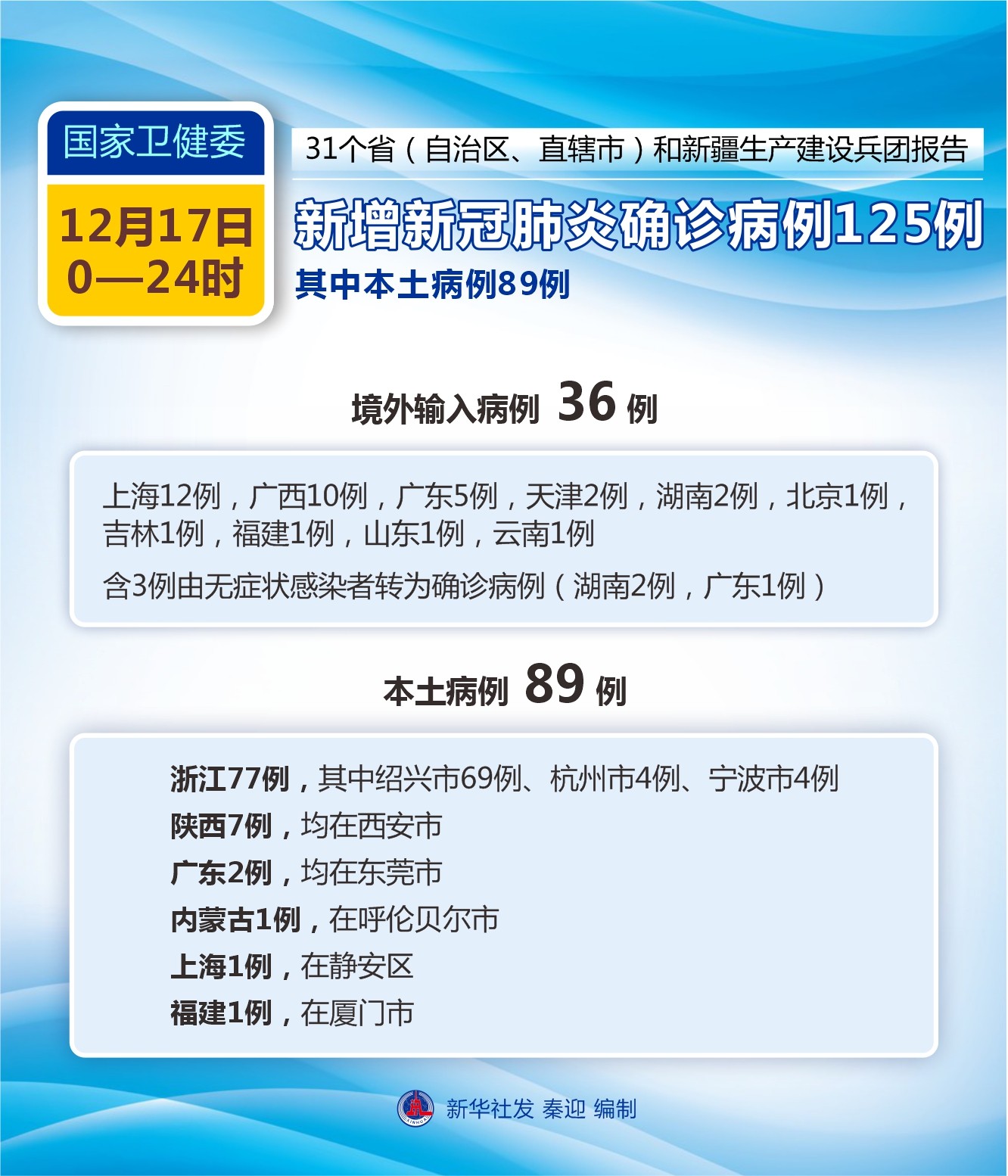 圖表:國(guó)家衛(wèi)健委:12月17日新增新冠肺炎確診病例125例 其中本土病例89例