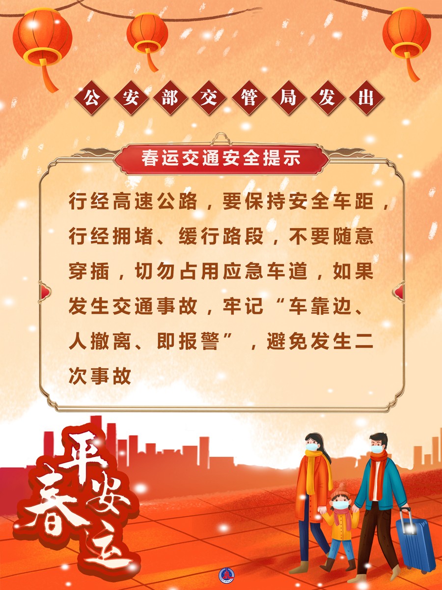 2022年春運(yùn)于1月17日開始。公安部交管局發(fā)出春運(yùn)交通安全提示:重點(diǎn)時段出行集中,低溫雨雪天氣多發(fā),需高度重視道路交通安全。