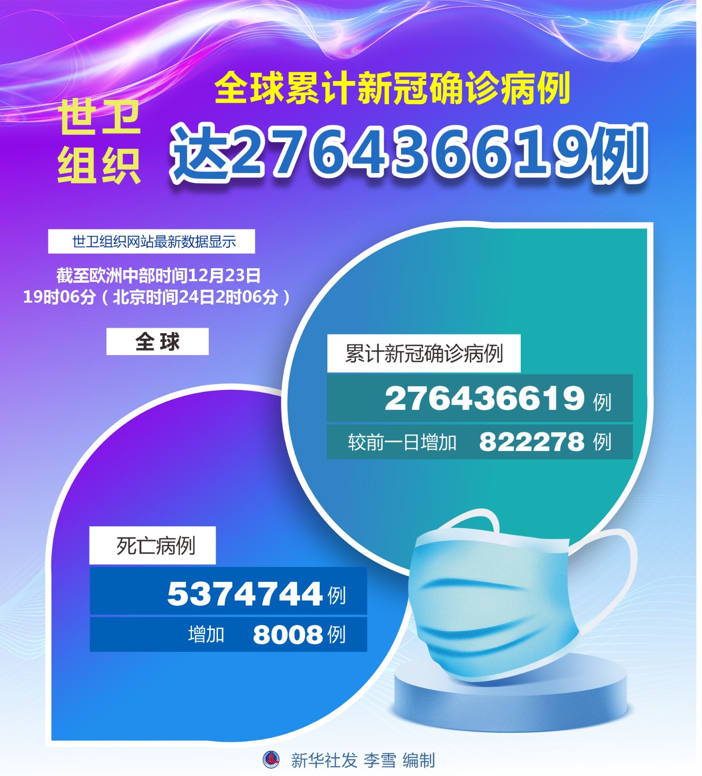 世界衛(wèi)生組織12月23日公布的最新數(shù)據(jù)顯示,全球累計(jì)新冠確診病例達(dá)276436619例。