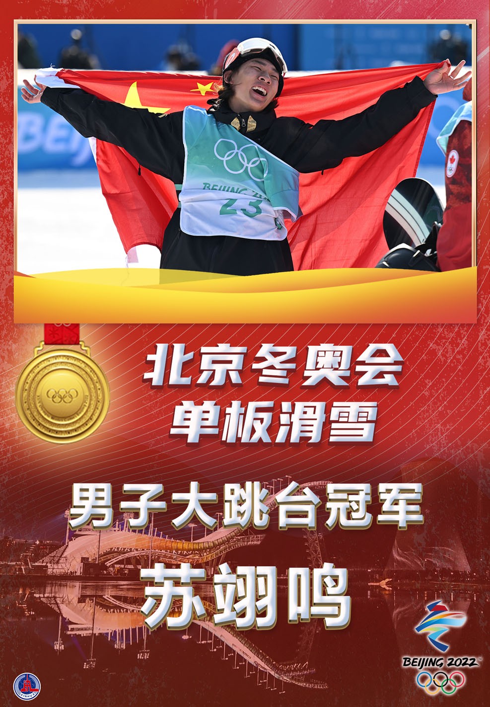 海報(bào):蘇翊鳴奪得單板滑雪男子大跳臺(tái)金牌