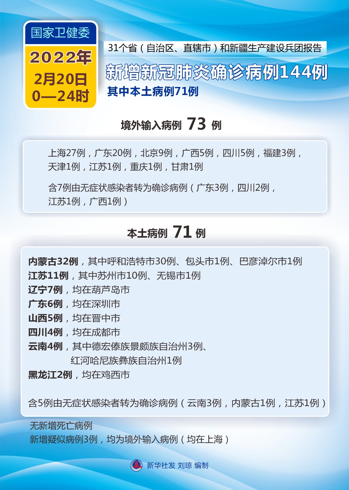 圖表:國(guó)家衛(wèi)健委:2月20日新增新冠肺炎確診病例144例 其中本土病例71例