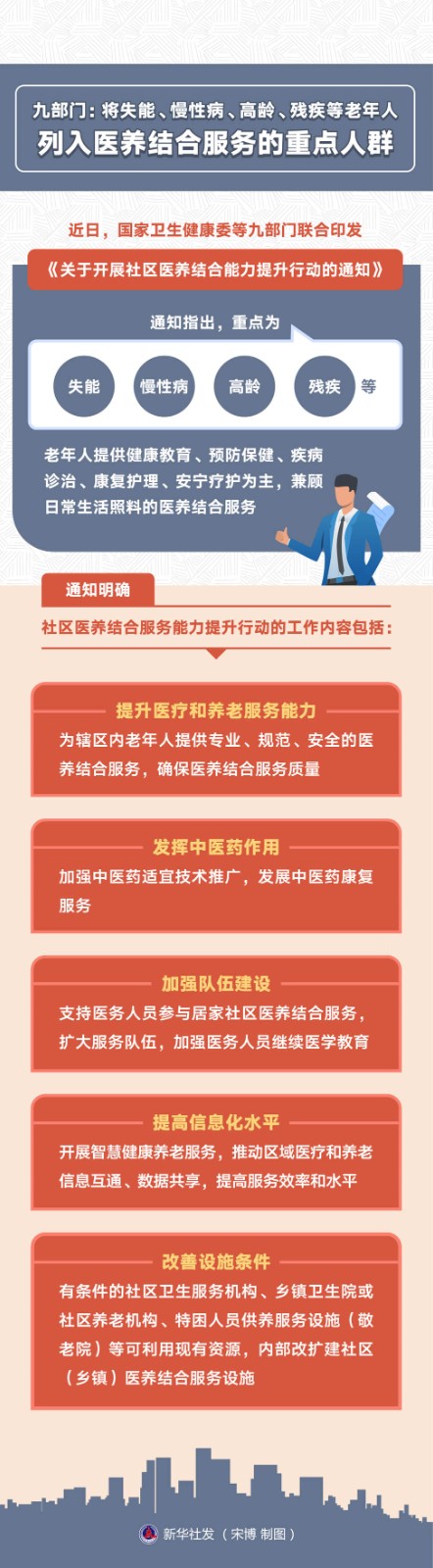 醫(yī)養(yǎng)結合是實現健康老齡化、滿足老年人健康養(yǎng)老服務需求的重要舉措。近日,國家衛(wèi)生健康委等九部門聯合印發(fā)《關于開展社區(qū)醫(yī)養(yǎng)結合能力提升行動的通知》。通知指出,重點為失能、慢性病、高齡、殘疾等老年人提供健康教育、預防保健、疾病診治、康復護理、安寧療護為主,兼顧日常生活照料的醫(yī)養(yǎng)結合服務。