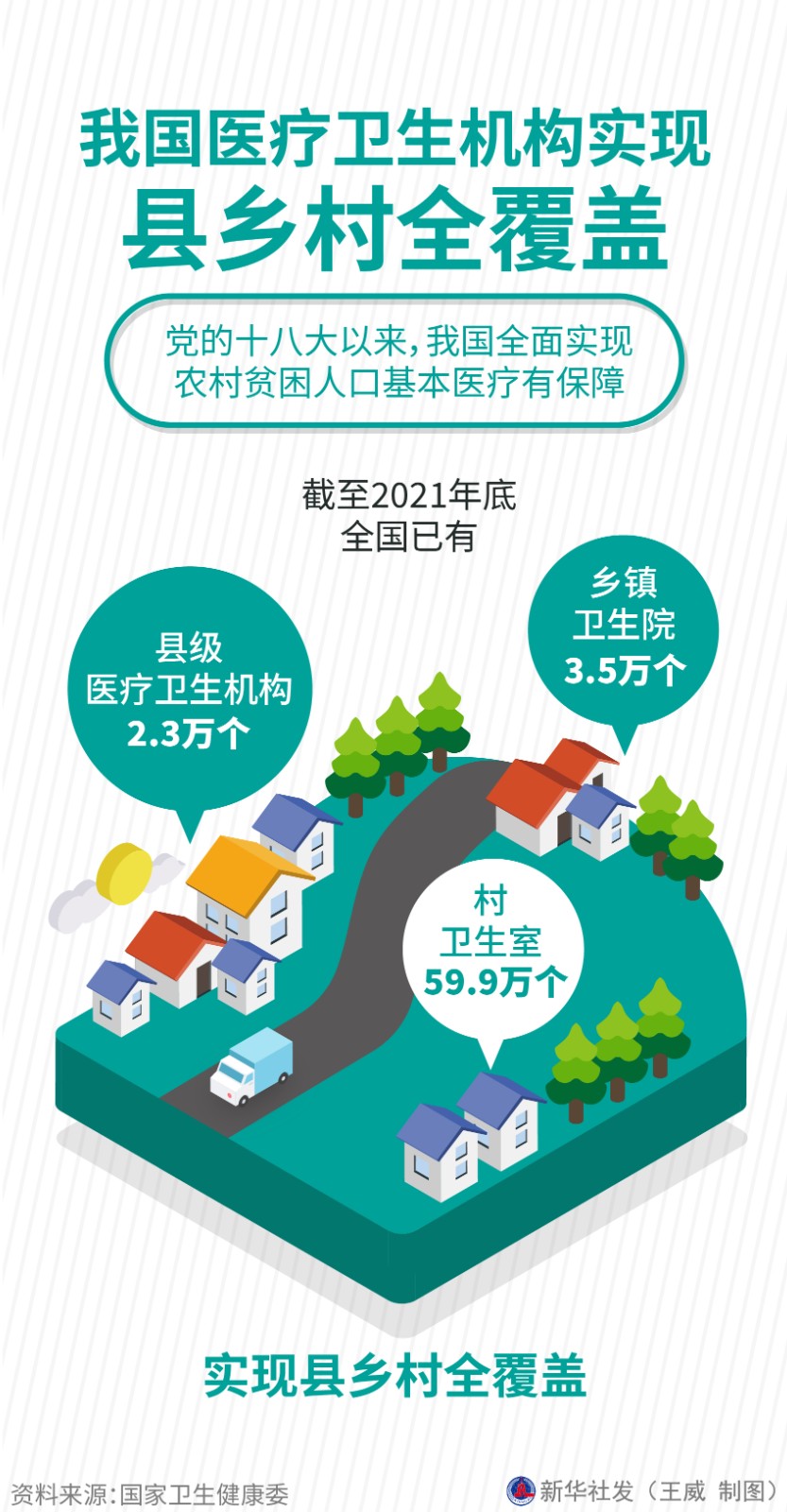 黨的十八大以來,我國全面實(shí)現(xiàn)農(nóng)村貧困人口基本醫(yī)療有保障。截至2021年底,全國已有縣級(jí)醫(yī)療衛(wèi)生機(jī)構(gòu)2.3萬個(gè),鄉(xiāng)鎮(zhèn)衛(wèi)生院3.5萬個(gè),村衛(wèi)生室59.9萬個(gè),實(shí)現(xiàn)縣鄉(xiāng)村全覆蓋。