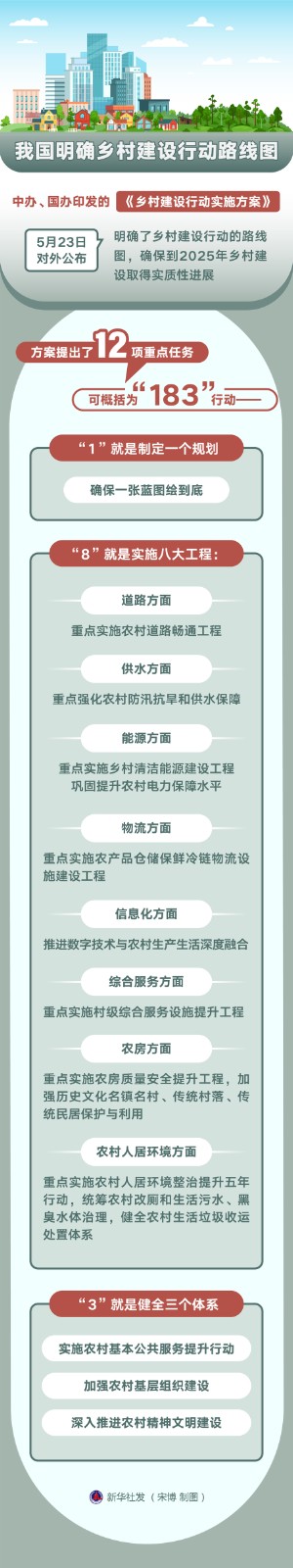 中辦、國辦印發(fā)的《鄉(xiāng)村建設行動實施方案》5月23日對外公布,明確了鄉(xiāng)村建設行動的路線圖,確保到2025年鄉(xiāng)村建設取得實質(zhì)性進展,農(nóng)村人居環(huán)境持續(xù)改善,農(nóng)村公共基礎設施往村覆蓋、往戶延伸取得積極進展,農(nóng)村基本公共服務水平穩(wěn)步提升,農(nóng)村精神文明建設顯著加強。
