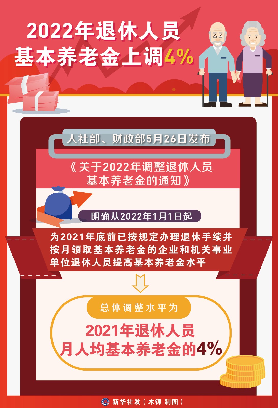 人社部、財(cái)政部5月26日發(fā)布《關(guān)于2022年調(diào)整退休人員基本養(yǎng)老金的通知》,明確從2022年1月1日起,為2021年底前已按規(guī)定辦理退休手續(xù)并按月領(lǐng)取基本養(yǎng)老金的企業(yè)和機(jī)關(guān)事業(yè)單位退休人員提高基本養(yǎng)老金水平,總體調(diào)整水平為2021年退休人員月人均基本養(yǎng)老金的4%。