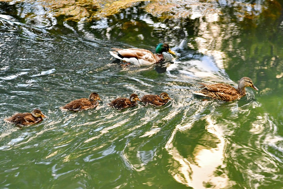 一對成年綠頭鴨帶著小鴨在拉魯濕地游動(5月27日攝)。