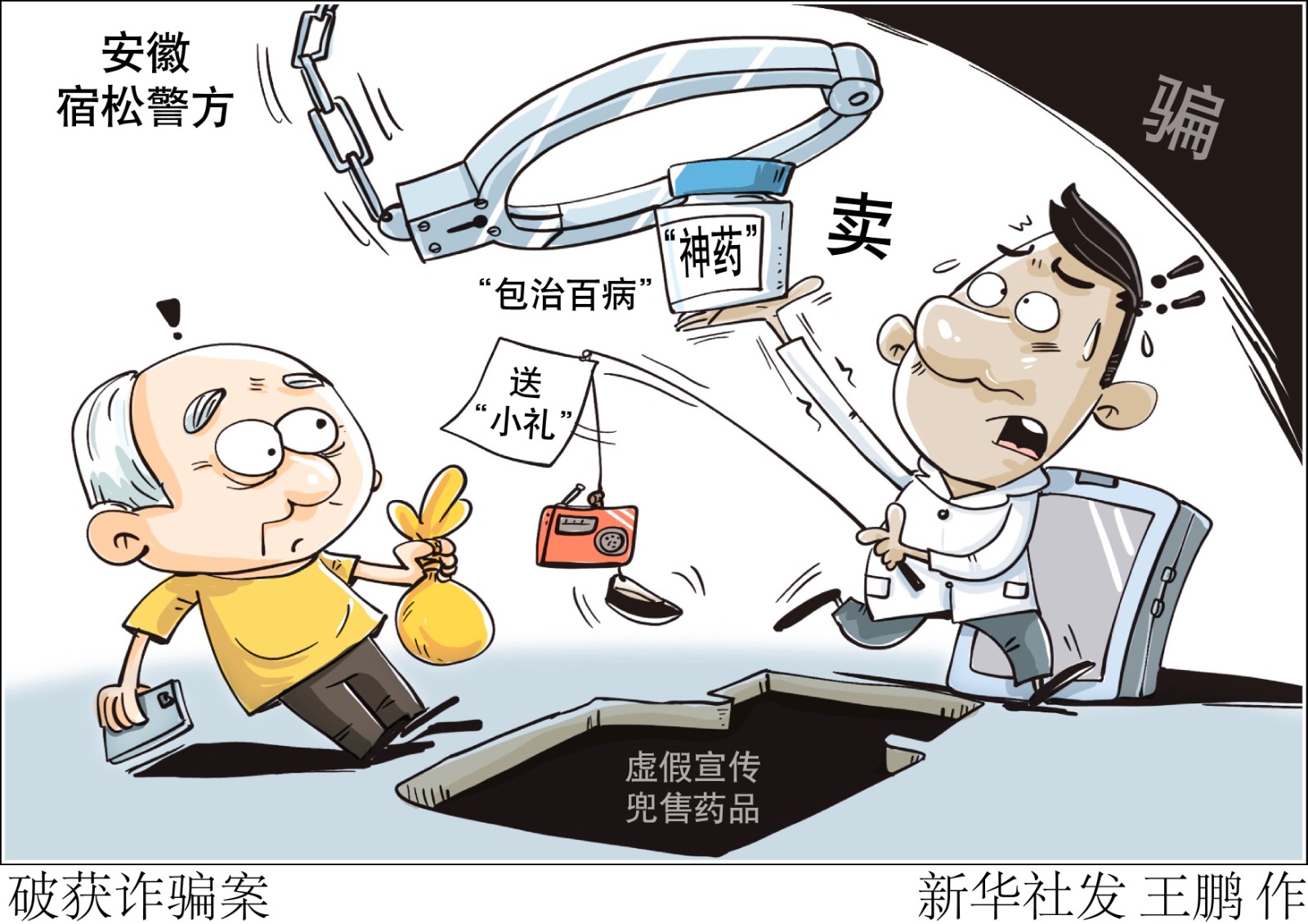 評(píng)書(shū)機(jī)、老人鞋等“小禮”請(qǐng)先笑納,“包治百病”的“神藥”快來(lái)試試?小心“騙你沒(méi)商量”!記者日前從安徽省安慶市宿松縣公安局了解到,當(dāng)?shù)鼐酱虻粢粋€(gè)向中老年群體虛假宣傳兜售藥品進(jìn)行詐騙的犯罪團(tuán)伙,全國(guó)多地?cái)?shù)千人上當(dāng),涉案金額近千萬(wàn)元。
