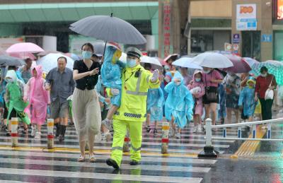 6月27日傍晚,湖北省荊門市公安局交警支隊民警在雨中,護送學(xué)生安全過馬路。當(dāng)天,荊門市發(fā)布暴雨橙色預(yù)警,荊門市公安局交警支隊民輔警提前到達各個護學(xué)崗點,在雨中積極疏導(dǎo)交通,護送學(xué)生安全過馬路,確保學(xué)校門前及周邊道路交通安全暢通。