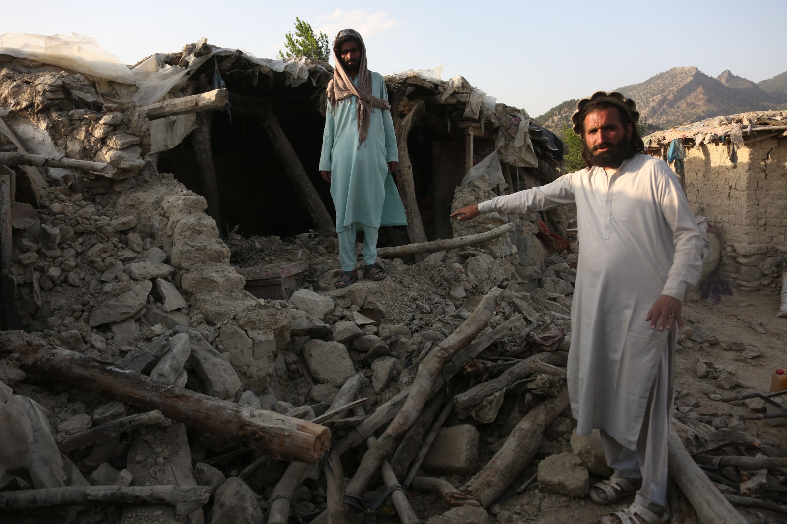 6月26日,在阿富汗霍斯特省,人們站在廢墟之中。