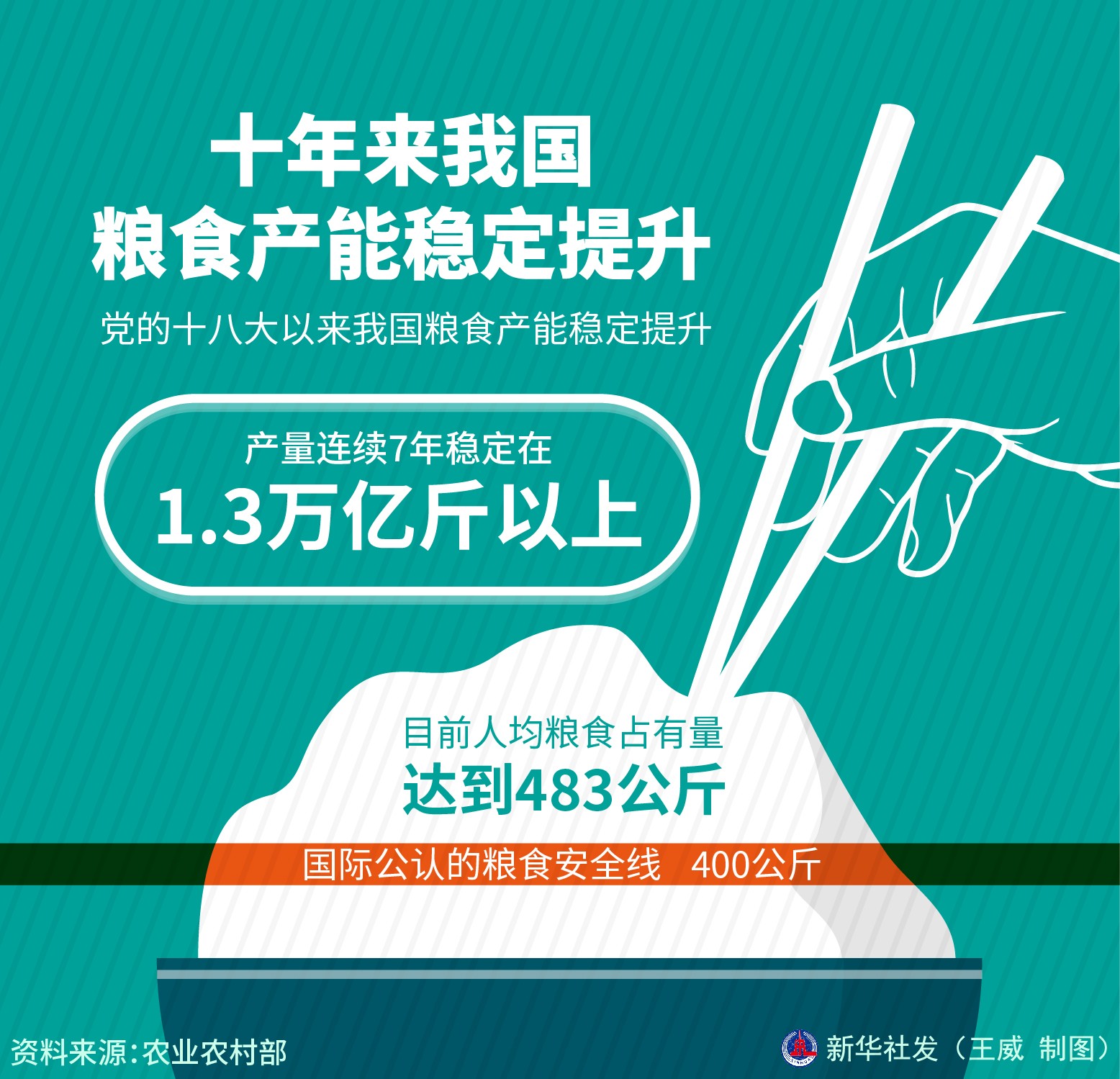 農(nóng)業(yè)農(nóng)村部副部長鄧小剛6月27日表示,黨的十八大以來我國糧食產(chǎn)能穩(wěn)定提升,產(chǎn)量連續(xù)7年穩(wěn)定在1.3萬億斤以上。目前人均糧食占有量達(dá)到483公斤,高于國際公認(rèn)的400公斤糧食安全線。