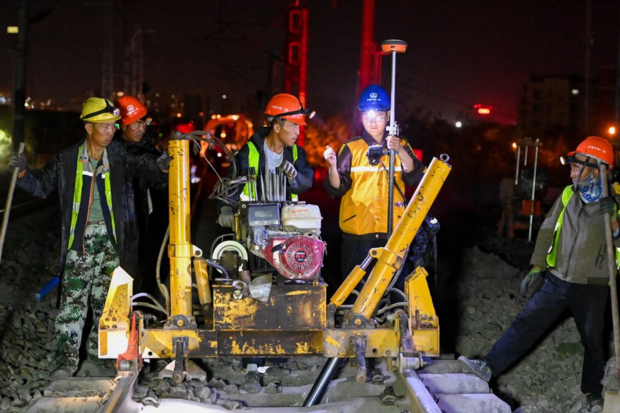 6月29日,在烏將鐵路地窩鋪車(chē)站擴(kuò)能改造施工現(xiàn)場(chǎng),中鐵一局的施工人員進(jìn)行起道作業(yè)。