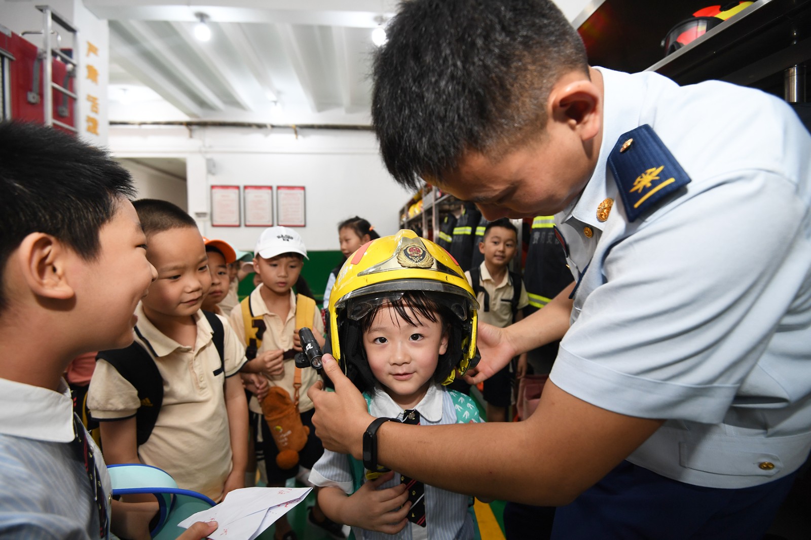 6月30日,貴州省貴陽市第十一幼兒園的小朋友在貴陽市南明區(qū)消防救援大隊體驗消防救援頭盔。