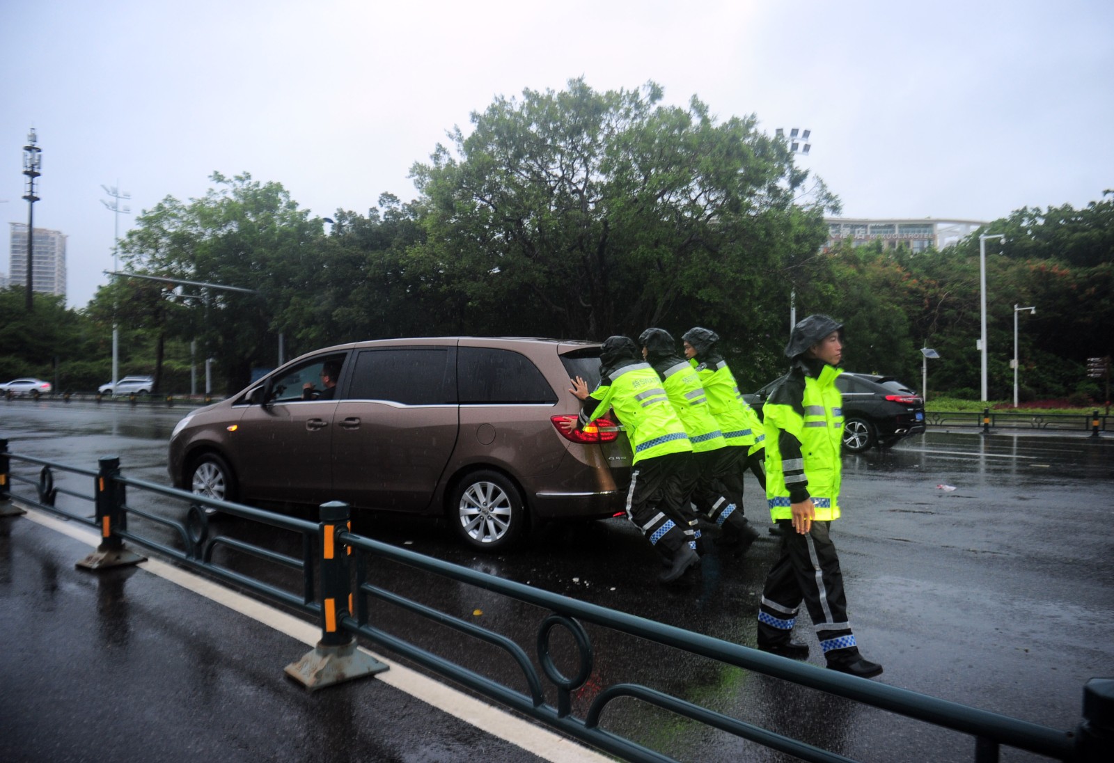 7月2日,在海南三亞,民警在雨中幫市民推故障車輛。