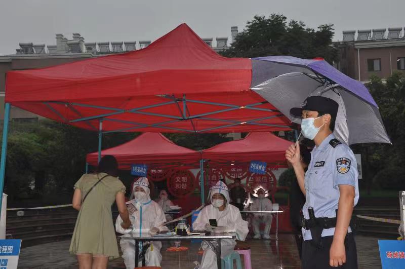 圖為7月5日,故黃派出所民警楊勍在梨都明珠小區(qū)核酸檢測現(xiàn)場冒雨值勤。