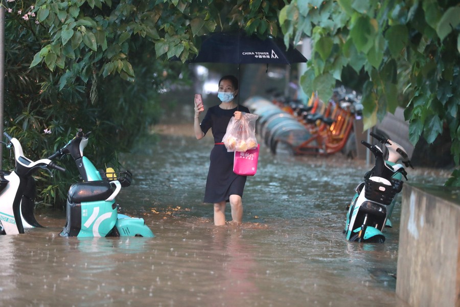 當(dāng)日,廣西南寧遭受暴雨襲擊,部分城市道路積水。