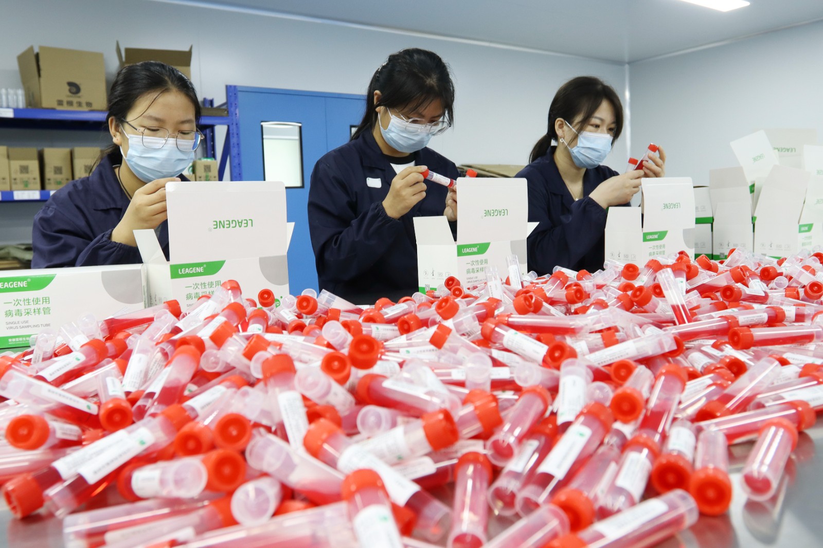 7月5日,在淮北市相山經(jīng)濟(jì)開(kāi)發(fā)區(qū)一家生物技術(shù)企業(yè)包裝車間,工人檢查采樣管。