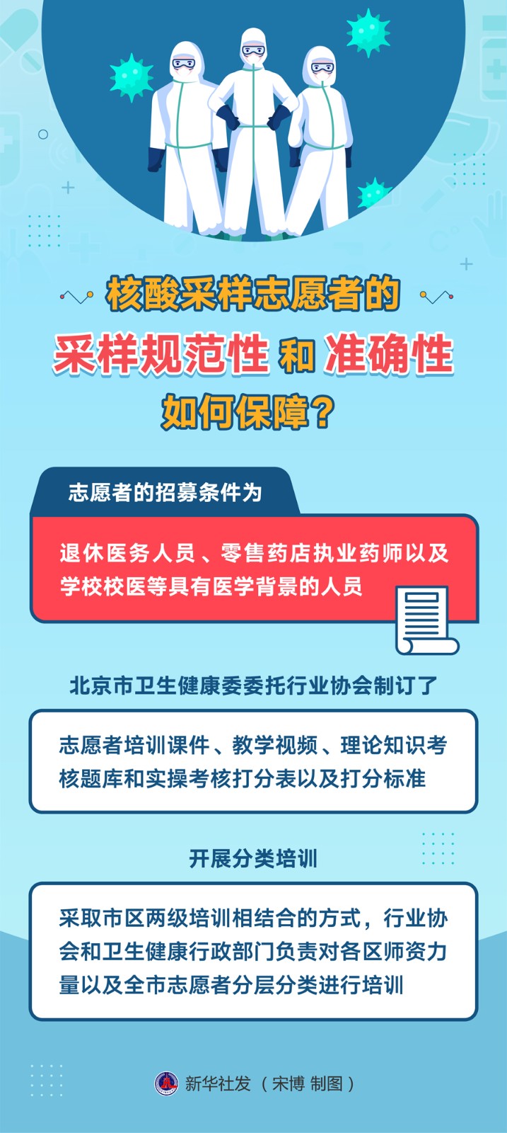 李昂表示,為確保志愿者采樣的規(guī)范性和準(zhǔn)確性,北京市衛(wèi)生健康委委托行業(yè)協(xié)會制訂了志愿者培訓(xùn)課件、教學(xué)視頻、理論知識考核題庫和實操考核打分表以及打分標(biāo)準(zhǔn),開展分類培訓(xùn),采取市區(qū)兩級培訓(xùn)相結(jié)合的方式,行業(yè)協(xié)會和衛(wèi)生健康行政部門負責(zé)對各區(qū)師資力量以及全市志愿者分層分類進行培訓(xùn)。