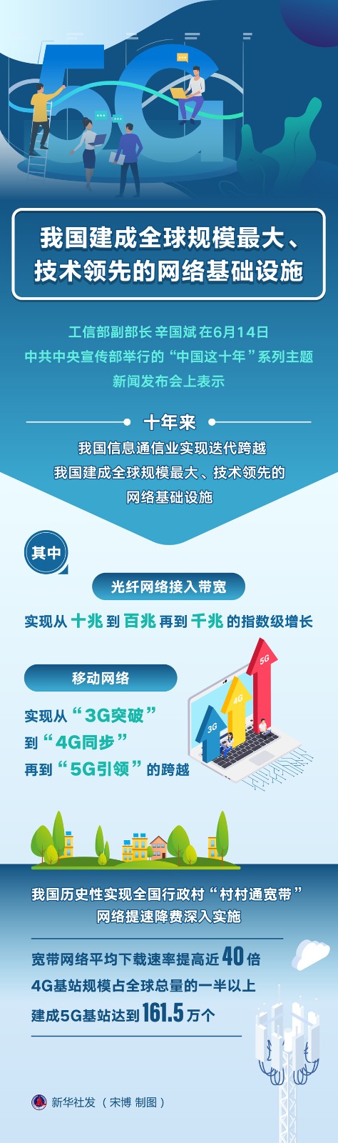 工信部副部長辛國斌在6月14日中共中央宣傳部舉行的“中國這十年”系列主題新聞發(fā)布會(huì)上表示,十年來,我國信息通信業(yè)實(shí)現(xiàn)迭代跨越,建成全球規(guī)模最大、技術(shù)領(lǐng)先的網(wǎng)絡(luò)基礎(chǔ)設(shè)施。其中,光纖網(wǎng)絡(luò)接入帶寬實(shí)現(xiàn)從十兆到百兆再到千兆的指數(shù)級(jí)增長,移動(dòng)網(wǎng)絡(luò)實(shí)現(xiàn)從“3G突破”到“4G同步”再到“5G引領(lǐng)”的跨越。