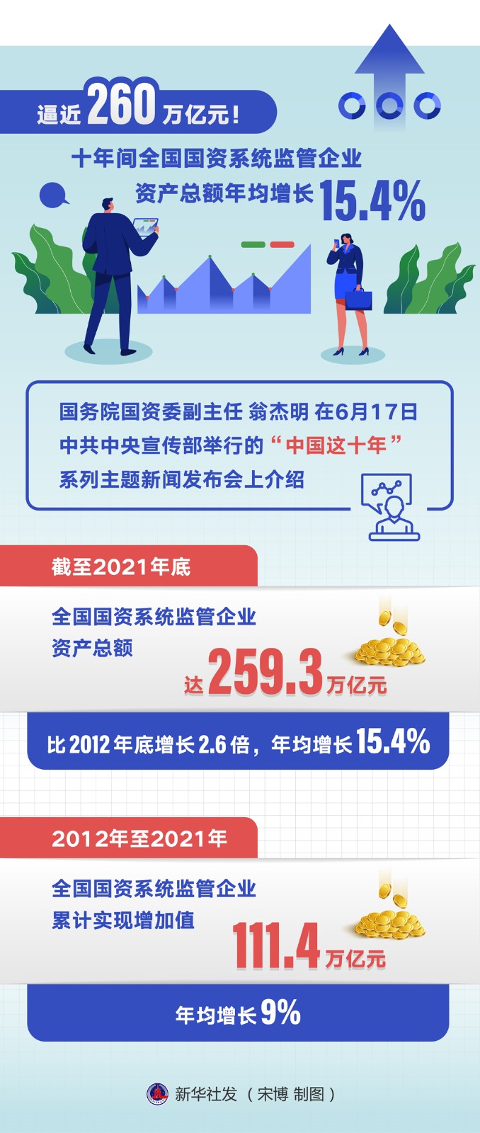 國(guó)務(wù)院國(guó)資委副主任翁杰明在6月17日中共中央宣傳部舉行的“中國(guó)這十年”系列主題新聞發(fā)布會(huì)上介紹,截至2021年底,全國(guó)國(guó)資系統(tǒng)監(jiān)管企業(yè)資產(chǎn)總額達(dá)259.3萬(wàn)億元,比2012年底增長(zhǎng)2.6倍,年均增長(zhǎng)15.4%;2012年至2021年,全國(guó)國(guó)資系統(tǒng)監(jiān)管企業(yè)累計(jì)實(shí)現(xiàn)增加值111.4萬(wàn)億元,年均增長(zhǎng)9%。